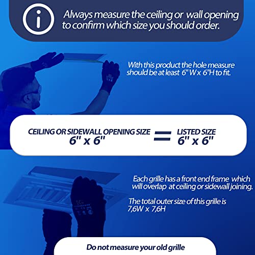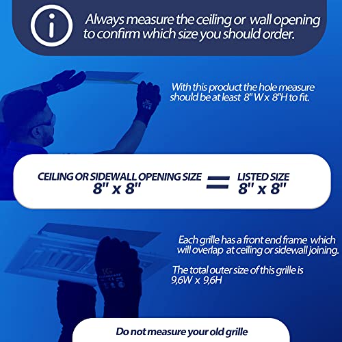 8 x 8 inch Duct Vent Cover. Air Supply HVAC Square Ceiling Diffuser with Opposing Blades Damper. 4 Way Extruded Aluminum Fixed Core. Low Noise. The Duct Hole Must Measure 8" x 8" to fit.