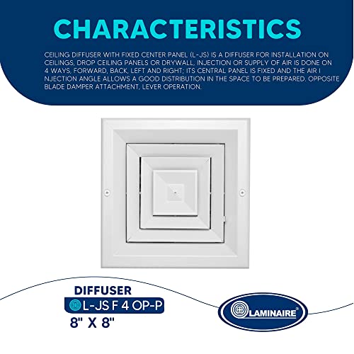 8 x 8 inch Duct Vent Cover. Air Supply HVAC Square Ceiling Diffuser with Opposing Blades Damper. 4 Way Extruded Aluminum Fixed Core. Low Noise. The Duct Hole Must Measure 8" x 8" to fit.