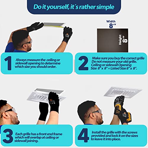 - [Measurements]: Always measure the wall or ceiling opening to confirm which size you should order. With this product the hole measure should be at least 8"W x 8"H to fit. Do not measure your old grille. Always measure the Width(W) first follow by the Height(H). Each grille has a front end frame which will overlap at sidewall or ceiling joining. The total outer size of this grille is 9.6"W x 9.6"H