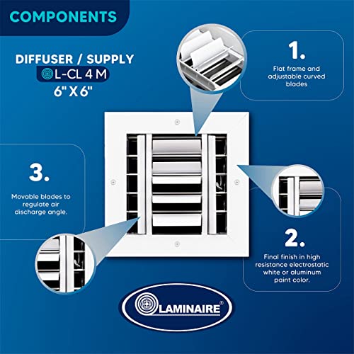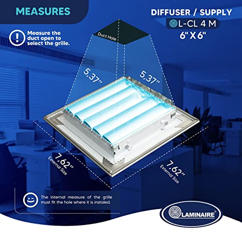 Details: Total outer size of this grille is: 11,625" Width X 11,625" height. The ceiling diffuser with mobile blades (L-CL) is a diffuser to be installed on ceilings, drop ceiling panels or drywall. Supply air direction set to 4 way (forward, bach left and right); its mobile blades allow the user to graduate the air diffusion cone. Its use is domestic and commercial applications, it can be installed in bedrooms, meeting rooms, commercial premises, offices, corridors, and other spaces for which it is suitable. FOR INSTALLATION: 1. OPEN A HOLLOW OF THE PRODUCT NOMINAL SIZE, ON A WALL OR CEILING. 2. SET THE GRILLE INSIDE THE HOLLOW. 3. ALIGN THE PRODUCT HORIZONTALLY AND VERTICALLY TO MAINTAIN PARALLELISM WITH THE OPENING. 4. TIGHTEN WITH SUPPLIED BOLTS. Today LAMINAIRE has a large product line of grilles, diffusers and dampers for the air conditioning and ventilation applications with the best technical specifications all-aluminum that has allowed us to be leaders in the Colombia market and to reach an important coverage in the American continent and the Caribbean islands. We have successfully entered the construction industry with architectural products, offering bioclimatic solutions, with energy savings, industrial enclosures and special applications for facades. Complementing our product line, we represent and commercialize equipment and accessories brands for air conditioning and ventilation applications. All the brands with the greatest trajectory and international prestige.