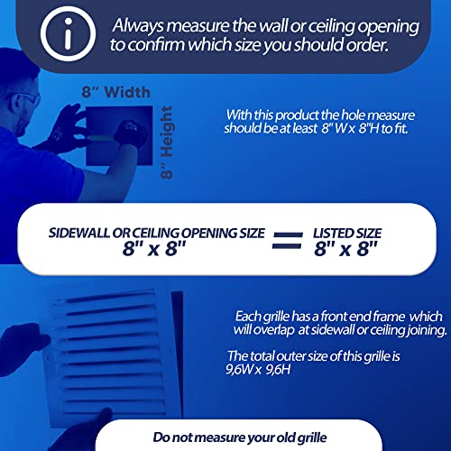 - [Sizing Guide]: Ensure accurate fit by measuring your wall or ceiling opening before ordering. For this grille, the opening should be at least 10"W x 10"H. Avoid using old grille measurements. Always start with the Width (W) followed by the Height (H). This grille comes with a front end frame designed to overlap at wall or ceiling junctions, with an overall external dimension of 11.6"W x 11.6"H.